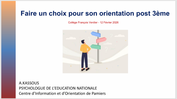 Par admin francois-verdier, publié le mardi 3 mars 2026 10:57 - Mis à jour le mardi 3 mars 2026 10:57Vous trouverez en pièce jointe le diaporama qui a été présenté par Mme Kassous, Psychologue de l'Education Nationale, Développement et conseil en orientation scolaire et professionnelle lors de la réunion d'information sur l'orientation post 3°. -